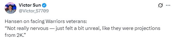 賽后談到首次在賽場上對陣庫里等勇士老將的感受,楊瀚森表示:那倒是不緊張,感覺人有點像是2K里投射出來的。